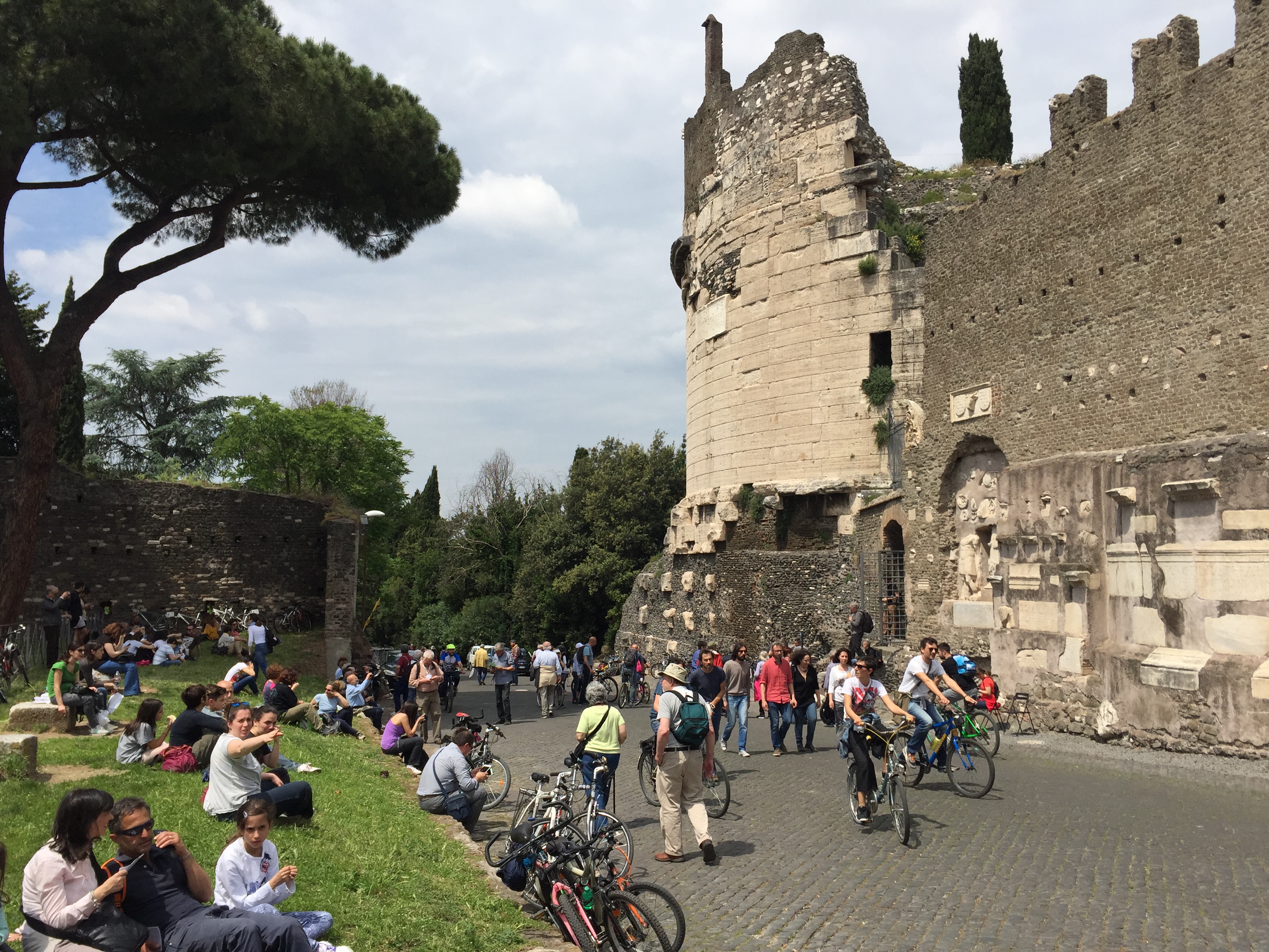 Alla fine ieri l’Appia Day è stato tipo vedere una Roma in miniatura di romani a piedi, a pedali, su ruota – anche macchina – o su pattini, su e giù per la Regina Viarum. I sanpietrini prima, il basolato poi. Pini e papaveri, erba da allergia, rose che spuntano da cancelli di ville belle che vabbè, iscrizioni, panini, rovine, pranzi seduti su prato o su tavoli, cornetti Algida e tortini di zucchine bio. Gazebo – per definizione brutti -, cappelli da texano, texani, file per fontanelle, file per bus, pedalate disinvolte, sudate, turisti pigri, curiosi veri, romani fricchettoni, romani che stanno lì a caso Ma sta Cecilia Metella è lontano? Pattini, ragazzini coi pattini, ragazzini che si incastrano sul basolato e piangono, ragazzini che cadono sul basolato si sbucciano e piangono. Poi ridono. Mariti e mogli, figli che litigano con le madri, genitori che fotografano i figli, genitori in tuta, figli che a due anni giocano col tablet ma anche a pallone, adolescenti al cellulare seduti sul marmo di chissà chi, urla, polline vagante, preti, battesimi, comunioni, matrimoni, calze di nylon, turchese brutto dei vestiti da cerimonia, ruggine sui cartelli dell’Appia di 30 anni fa, infradito, camperos, monopattini pure.