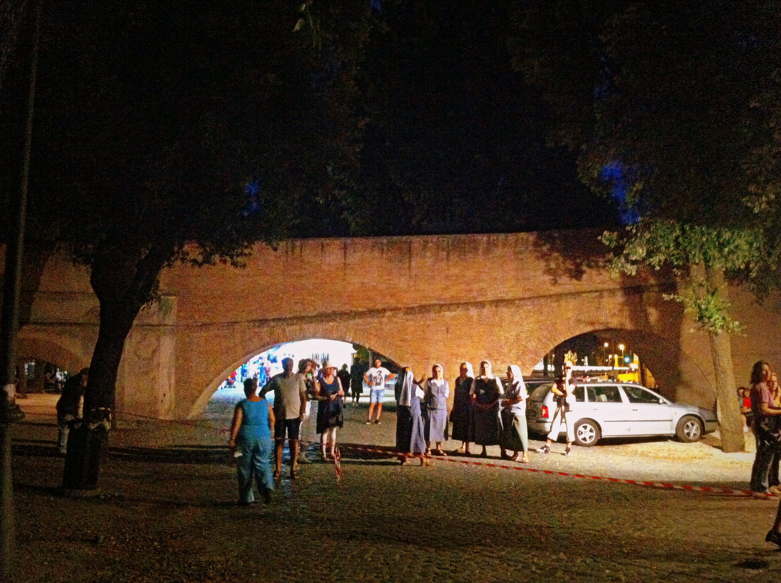 Ohh finalmente in città, l’aria di Roma ci era mancata. Cosa fare stasera? Decido per l’Arena numero due di Castel Sant’Angelo. Arriviamo, io e un amico brussellese-romano e ci sediamo in prima fila per un Reality di Garrone ancora mai visto – che mi è piaciuto molto. Lui, l’amico, non si pronuncia perché dice che bisogna aspettare prima di parlare dei film. Anche a Bruxelles faceva così. Non gli cavi una parola di bocca. Mi infastidisce ma in realtà la trovo una cosa saggia. Meglio stare zitti-. Insomma, dopo otto minuti sale una puzza straziante di carcassa di animale da Tevere. Così, tutta d’un botto. Calati tra un cielo ancora blu chiaro, e un Mausoleo dai mattoncini rossastri illuminati da una luce dorata, ci ritroviamo a respirare a fatica quel fetore immondo. Di Reality mi rimarrà per sempre l’accompagnamento di topo morto. E’ stato divertente per qualche verso: ti giravi e vedevi, con cadenza di 20 minuti, la platea col naso tappato, chi con dita, chi con sciarpette
