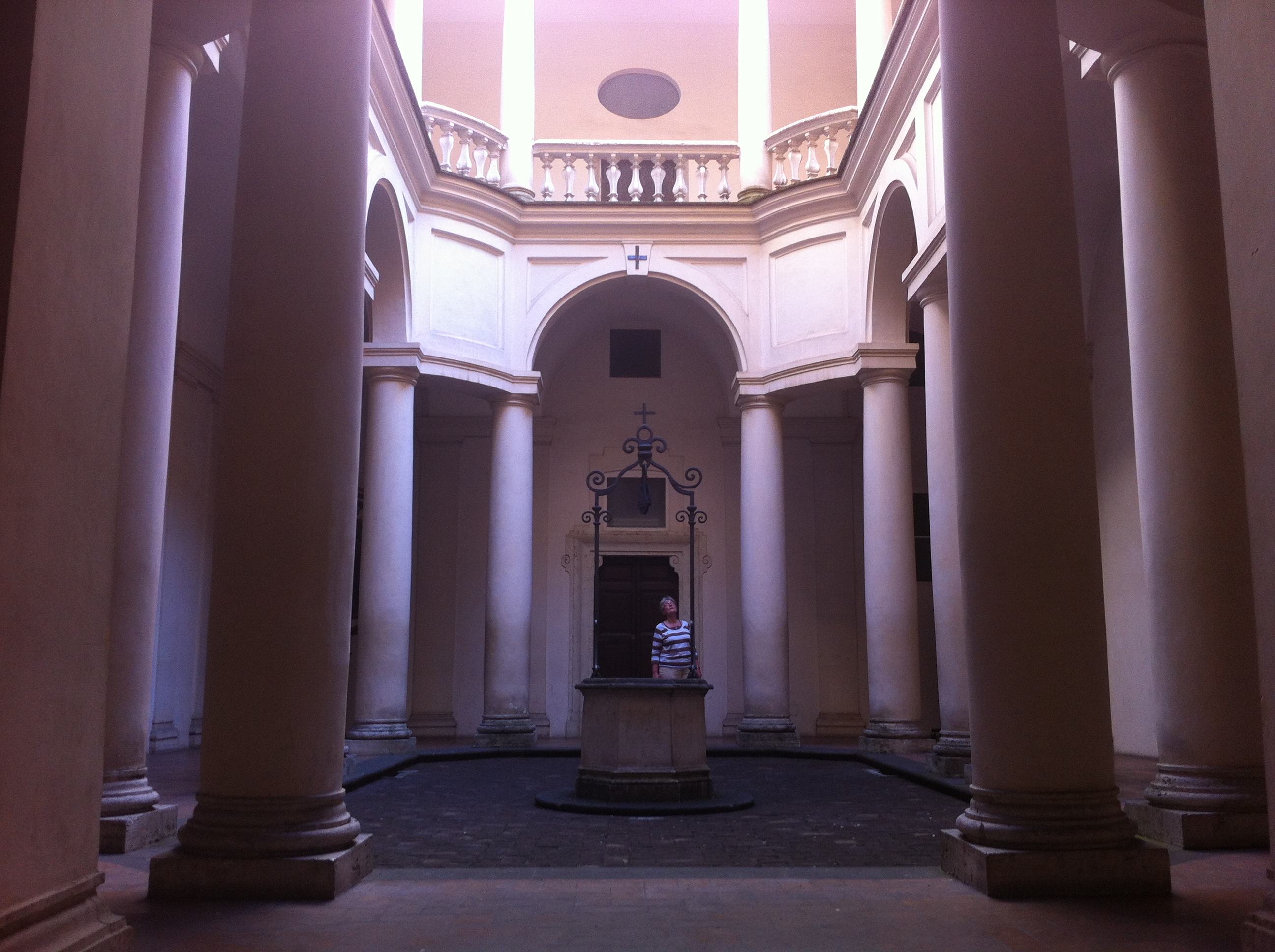 La cisterna, i fiori, le arcate. Il cielo quadrato o rettangolare sopra tutto. Vorrei prendere i ricordi e rinchiuderli lì in quei chiostri con il celofan, quello dei panini. I posti, le cose, i momenti. Tutti lì, per sicurezza. Il Chiostro del Bramante, San Carlino alle Quattro Fontane reso allegro solo dalle strisce della maglietta di una turista (tedesca?). Il Chiostro dei Santissimi Quattro. Sant’Onofrio al Gianicolo che con la sua fontana e il verde scintillante del proprio prato sembra un posto finto. Il Chiostro dei Piceni di San Salvatore in Lauro. Sant’Ivo alla Sapienza. Si può fermare tutto per un momento nei chiostri. Poi il rosso dei gerani, quando ci sono, riportano a questo fine maggio romano. Però, con quel celofan sopra, diventerebbe un po’ come quelle cupolette orrende di plexiglas che quando le giri nevica.. I cubi di ricordi nei chiostri sarebbero perfetti, invece.