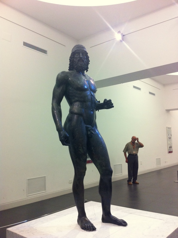 I Bronzi di Riace ci appaiono così, di lato. Le cosce perfette, prima ancora del viso – mi chiedo ancora perché sia stato scelto quell’allestimento-. A Reggio Calabria passeggiamo sul lungomare, – con in testa il racconto di come il sindaco dal ’93 al 2001, Italo Falcomatà, fece rifiorire Reggio-. Poi vedo che proprio su quel “Lungomare Falcomatà” l’ex Arena dello Stretto è stata intitolata “Anfiteatro Senatore Ciccio Franco” da Scopelliti nel 2006.