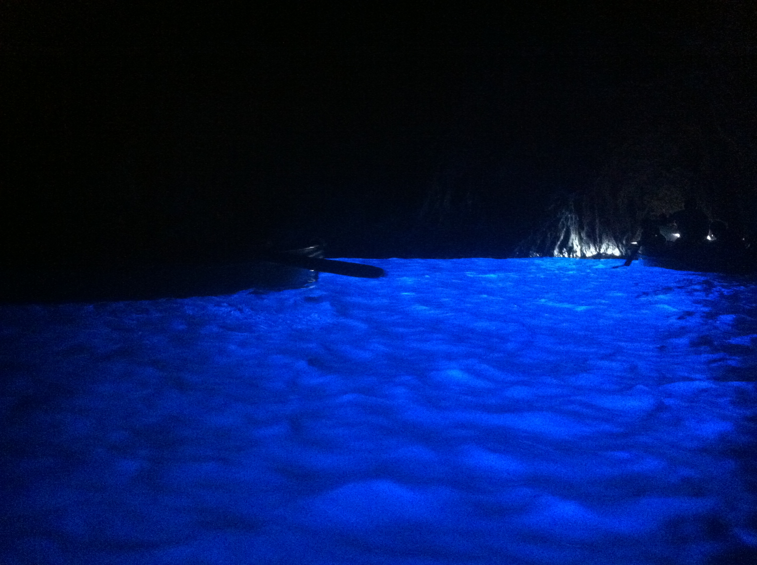 Poi d’improvviso è il mio turno. Entro. Stessa scenetta coi marinai. Mi appiattisco giù, la marea ancora c’è e l’acqua ancora un po’ alta rende bassissimo l’ingresso alla porta. Cazzo non avevo pensato potesse essere così basso. Il marinaio segue le indicazioni del capo che sorveglia sulla scaletta. Dopo tre tentativi falliti e tre onde troppo alte siamo dentro. L’aria è calda. Il blu sembra nero all’inizio. Troppe aspettative forse. Il marinaio l’avrà spiegato milioni di volte che Aspetta, l’occhio mo’ s’abitua. In un caos di barchette 10, 15, tutto si riempie. I turisti impazziti, i marinai che cantano, ognuno per il proprio equipaggio. Forse più le canzoni napoletane sono urlate, più mance sono. Il mio timoniere non canta e mi parla del passaggio segreto nella roccia da cui l’imperatore Tiberio scendeva giù. Mi racconta delle statue ritrovate e ormai, quasi un’ora dopo, mi gira la testa. Provo a immaginare Tiberio lì. Non ci riesco. Vorrei uscire pure se l’occhio è completamente abituato al blu elettrico – forse il troppo blu annulla i pensieri- e le orecchie alle grida dei turisti e marinai.