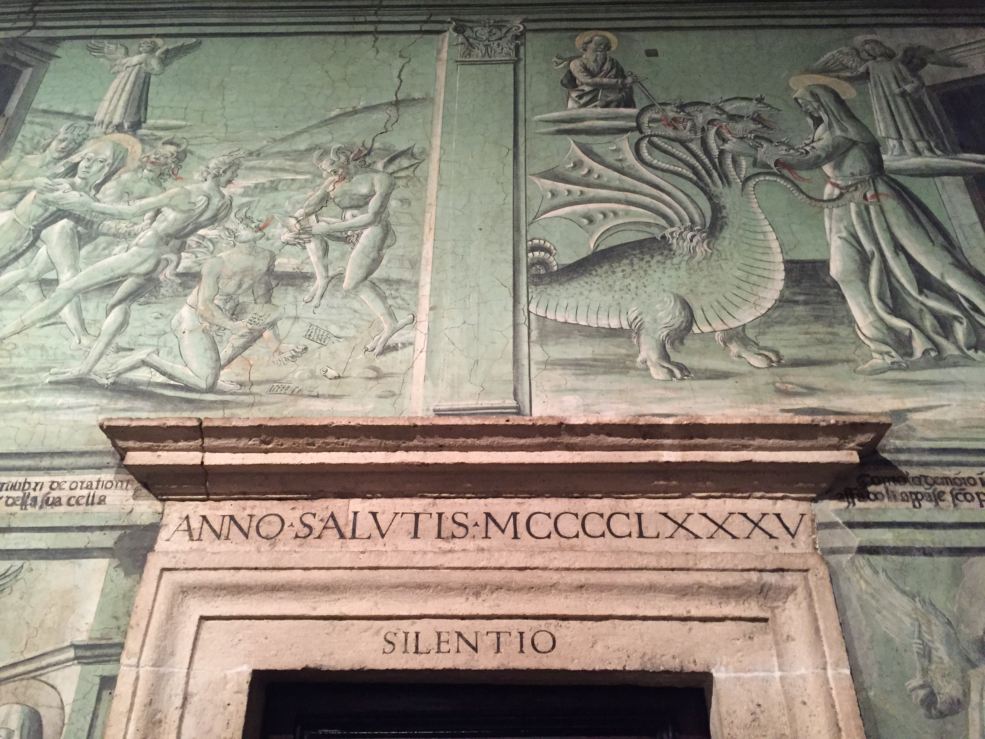 C’era un periodo di due anni fa, l’estate dei turni dell’alba da stagista ai programmi Rai, in cui stavo in fissa con i chiostri. Col pomeriggio libero alternavo Fregene a visite compulsive di chiostri. Li cercavo e stavo ore, perché fotografarli è un casino e appaiono sempre più brutti di quelle meraviglie che sono. Una delle cose che ho imparato da questi fruttuosi pomeriggi è che con le centraliniste/portieri dei monasteri bisogna sempre, sempre insistere. Quando la signora delle monache oblate m’ha detto Ma no cara non fai in tempo oggi, passa l’anno prossimo, ho capito che era il caso di correre. Sono arrivata in tempo per la prima stanza, le tentazioni di Santa Francesca Romana. E il custode m’ha detto Attenta che dillà c’è la suora.