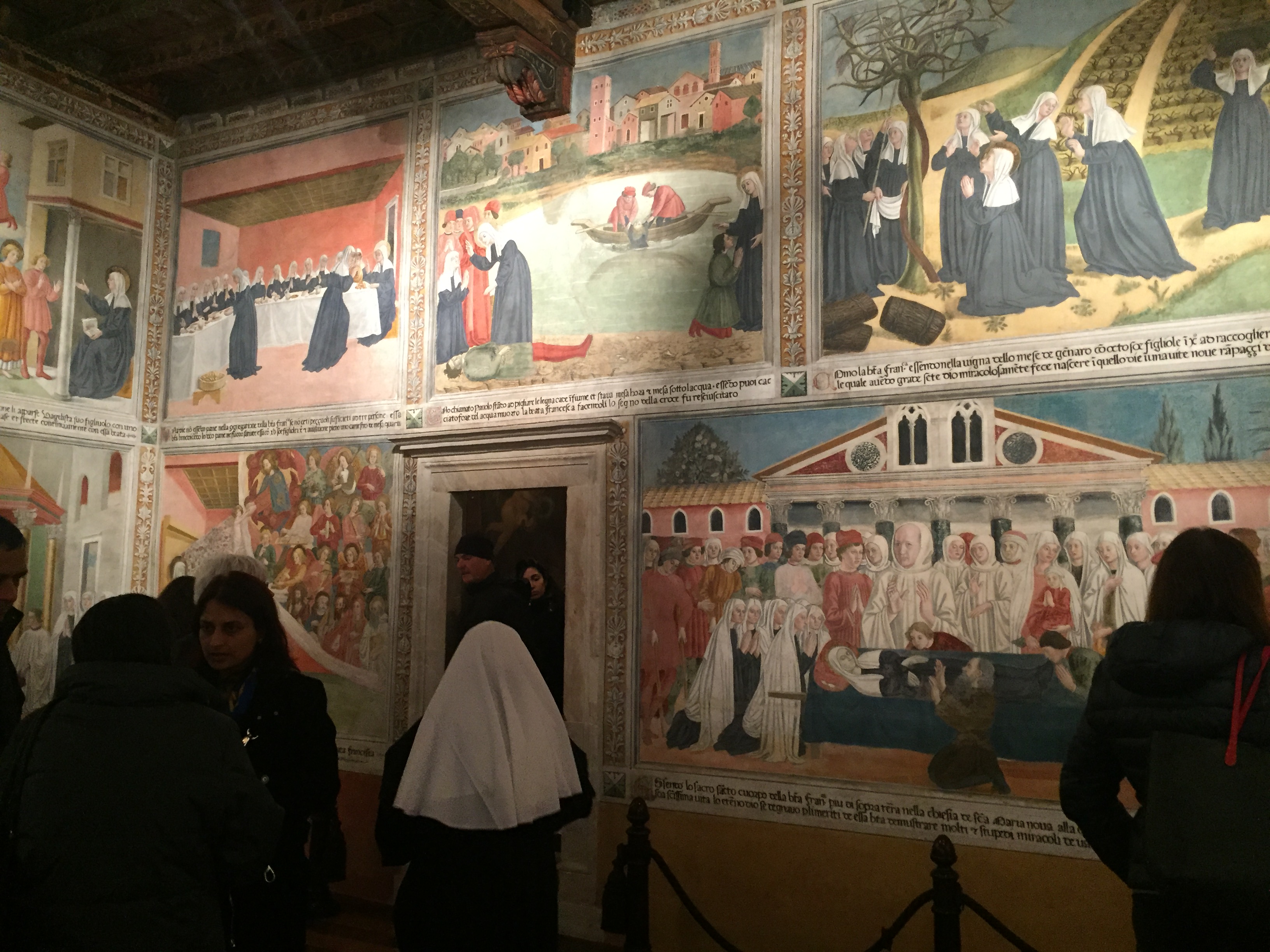 Ci sono posti a Roma che sono aperti un giorno l’anno. Se non becchi quel giorno, se fai tardi, se ti scordi, ciao. Allora l’altro giorno una persona cara mi ha detto Se hai un attimo vai alle Stanze di Santa Francesca Romana a Tor de Specchi, splendide pitture murali, tipo fumettoni medioevali. È stato quel fumettoni medievali.. Da quel momento non ho fatto altro che pensare ai fumettoni. E quindi nulla mi ha fermata. Non il viaggio Pisana-Roma centro, non gli otto lavori che fai insieme perché Tocca fare così voi giovani professionisti, non il sit in per la pace fuori Montecitorio con Don Ciotti, non i pacifisti che mi appioppavano un sacco di volantini mentre avevo le mani occupate dai troppi dispositivi elettronici tutti insieme, e i fili e l’hotspot che non funziona, e l’articolo che devi mandare ma l’iPad non ce l’ho che ho già investito il primo stipendio nella telecamera. Non mi ha fermata nemmeno l’arrivo di Totò Cuffaro all’Arion Montecitorio, due metri oltre Don Ciotti, per la presentazione del libro sulla verità del suo processo. Che mi puoi mandare due foto di Cuffaro?